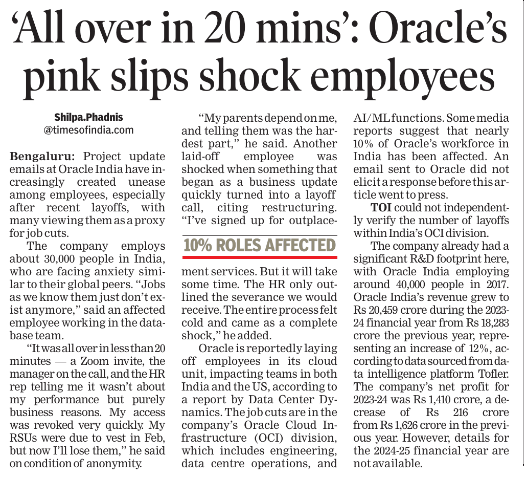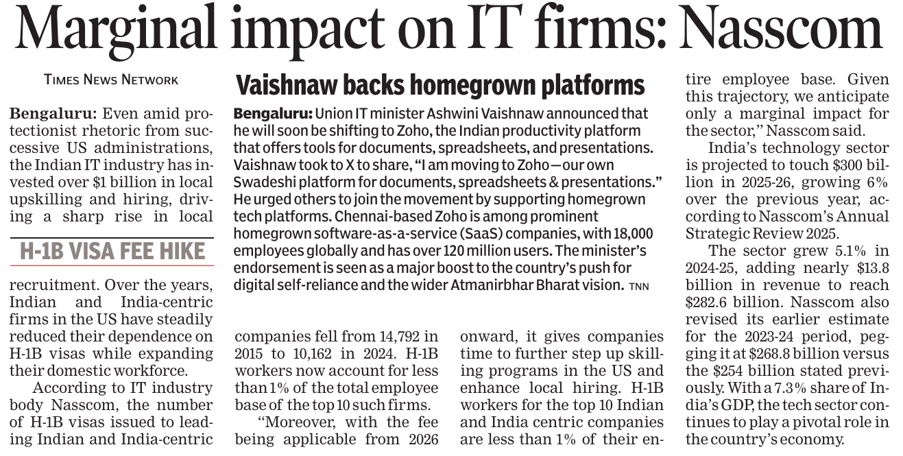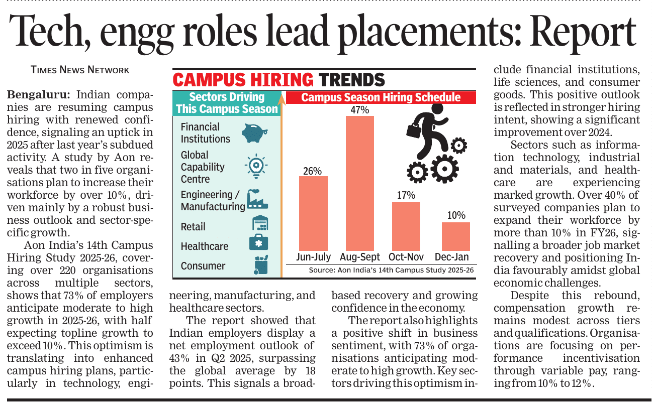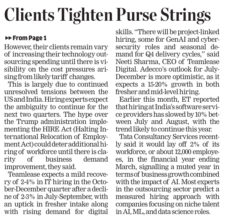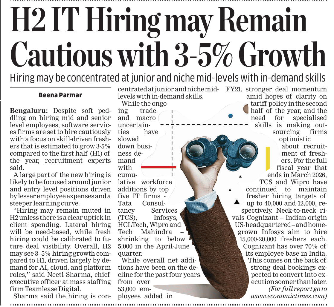 News And Articles Marginal impact Of Visa Hike on IT firms_ Nasscom20250923 Tech, engg roles lead placements_ Report20250917 Campus Hiring in India Rebounds with Focus on Skills, Culture and Retention Oracle India layoffs spark unease amid AI push Legal Battle Looms As Don Drops H-1B omb20250921 No festive spark for IT in Q2, macro headwinds weigh heavily on growth20251006 INNOVATION AS AMMO, GUJ’S DEFENCE STARTUPS AIM BIG H2 IT Hiring may Remain Cautious with 3-5_ Growth IT Scrambles for Benchmarks as Clients Eye Outcome-based Deals Cost to Company Too High for Sponsoring (Most) Staff Uncertainty Hits IT, Hiring Demand Falls 10_ in August ‘Q4_ Weak foreign funding lowers hiring sentiment’ Campuses expect minimum impact on hiring of freshers by IT firms this year AI may boost global trade by nearly 40_ in 15 yrs_ Report20251019 ‘All over in 20 mins’_ Oracle’s pink slips shock employees20250909 Tier II, III Cities Outshine Metros with 21 _ Hiring Surge in Sept McD’s to invest $100m in Hyd in next 2 years Clients Tighten Purse Strings Leadership Isn’t A Solo Act20250916