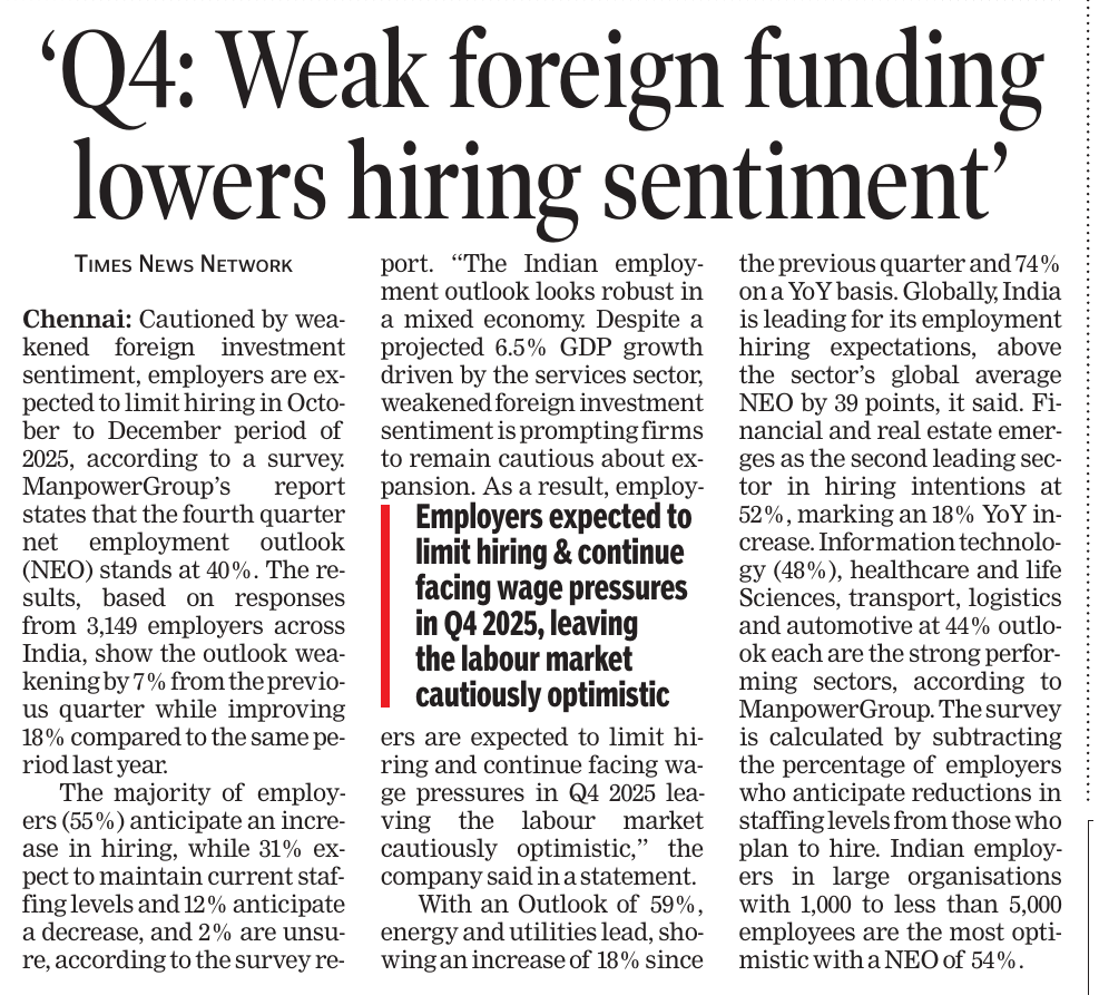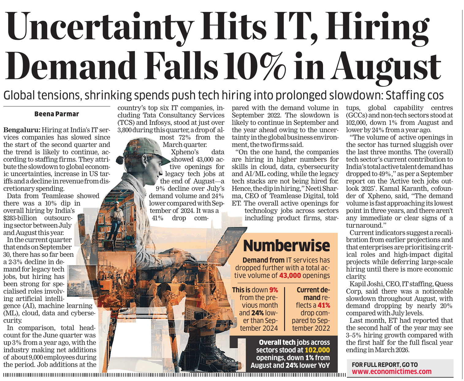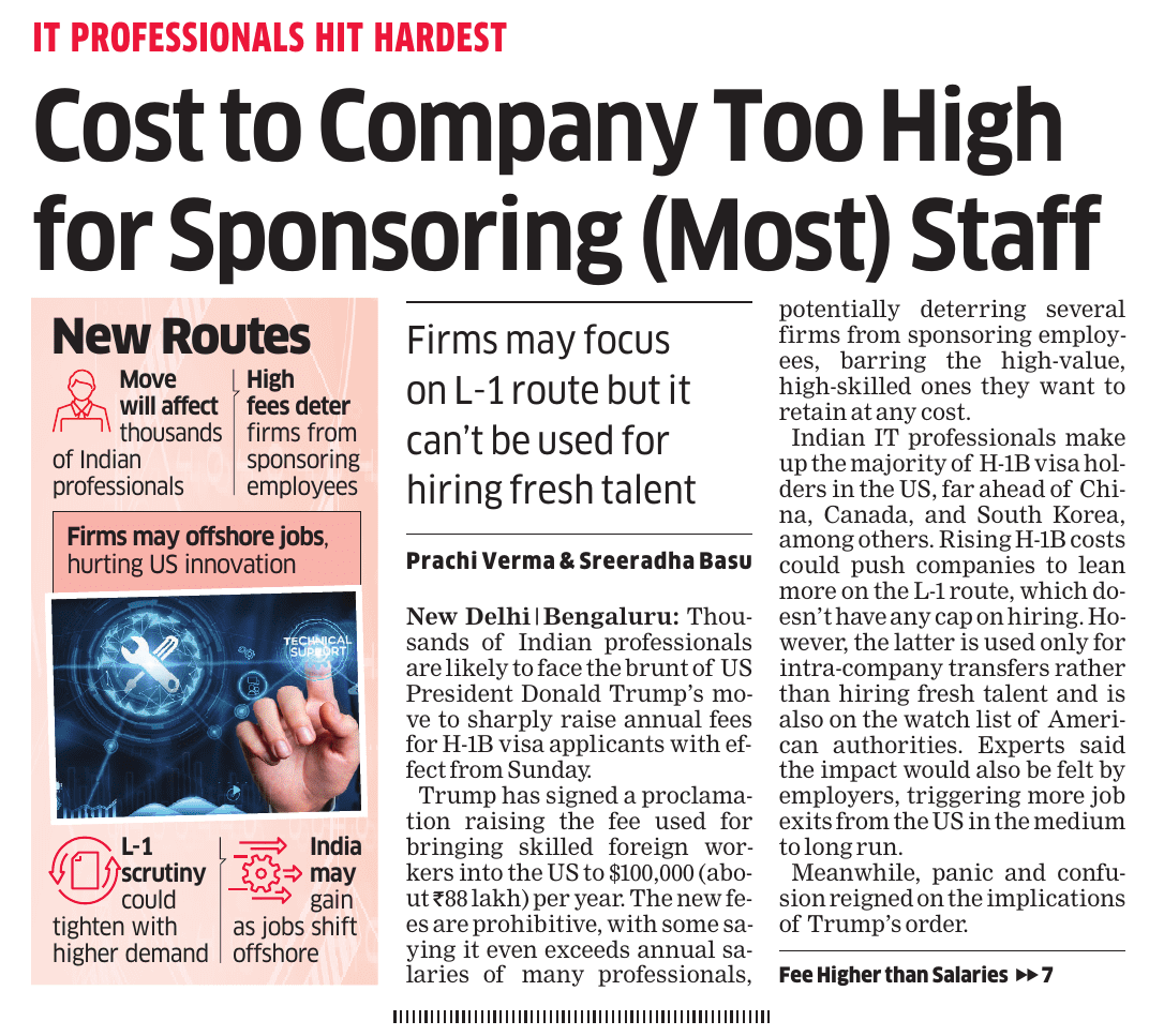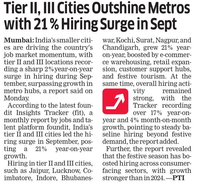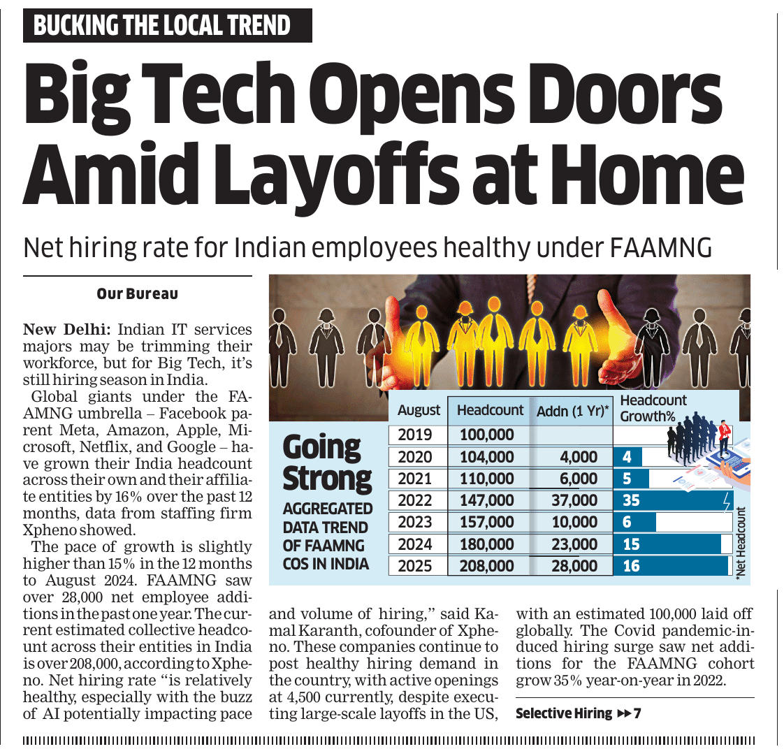 News And Articles Marginal impact Of Visa Hike on IT firms_ Nasscom20250923 Tech, engg roles lead placements_ Report20250917 Campus Hiring in India Rebounds with Focus on Skills, Culture and Retention Oracle India layoffs spark unease amid AI push Legal Battle Looms As Don Drops H-1B omb20250921 No festive spark for IT in Q2, macro headwinds weigh heavily on growth20251006 INNOVATION AS AMMO, GUJ’S DEFENCE STARTUPS AIM BIG H2 IT Hiring may Remain Cautious with 3-5_ Growth IT Scrambles for Benchmarks as Clients Eye Outcome-based Deals Cost to Company Too High for Sponsoring (Most) Staff Uncertainty Hits IT, Hiring Demand Falls 10_ in August ‘Q4_ Weak foreign funding lowers hiring sentiment’ Campuses expect minimum impact on hiring of freshers by IT firms this year AI may boost global trade by nearly 40_ in 15 yrs_ Report20251019 ‘All over in 20 mins’_ Oracle’s pink slips shock employees20250909 Tier II, III Cities Outshine Metros with 21 _ Hiring Surge in Sept McD’s to invest $100m in Hyd in next 2 years Clients Tighten Purse Strings Leadership Isn’t A Solo Act20250916